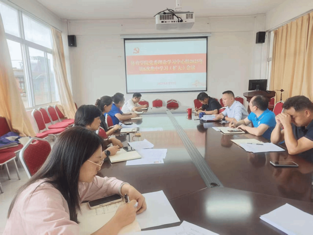 2025年8月27日15:30,体育学院在401会议室召开党委理论学习中心组 2025 年第六次集体(扩大)学习会。会议由学院党委中心组主持人李杰庆主持,学院党委委员全程参与学习,非党员领导班子成员、各科室负责人及党支部书记列席会议。本次学习以“深入学习习近平总书记重要文章《锲而不舍落实中央八项规定精神,以优良党风引领社风民风》” 为核心主题,旨在进一步统一思想、凝聚共识,以严的作风、实的举措推动学院校风、教风、学风建设,为学院高质量发展夯实作风根基。