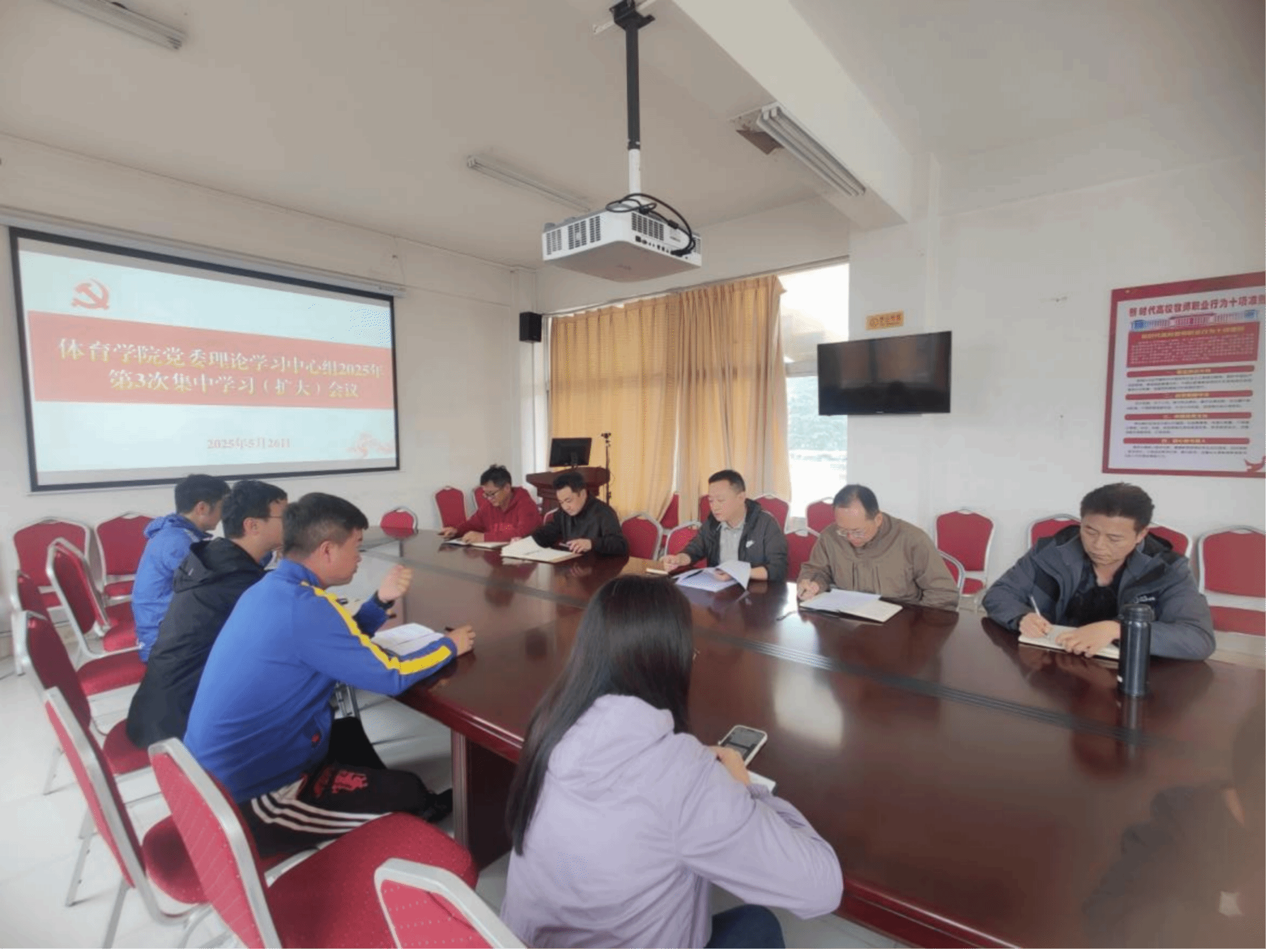 2025年5月26日,体育学院党委理论学习中心组举办2025年度第三次集中学习在学院401会议室举行。会议由学院党委书记李杰庆主持,院党委委员、党政班子成员、各科室负责人以及各党支部书记参加了中心组学习。