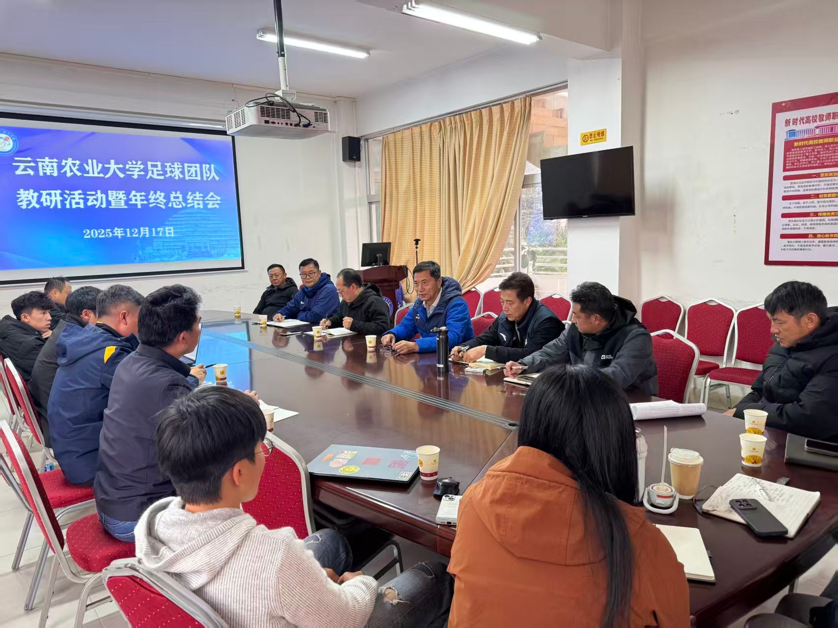 为系统梳理2025年足球项目发展成果,精准谋划未来发展方向,12月17日,足球团队教研活动暨年终总结会在体育学院四楼会议室顺利召开。足球教师及教练、科研、医疗及体能相关领域骨干教师齐聚一堂,学院银龄教师、福建师范大学蔡向阳教授受邀出席,共话足球事业发展蓝图。