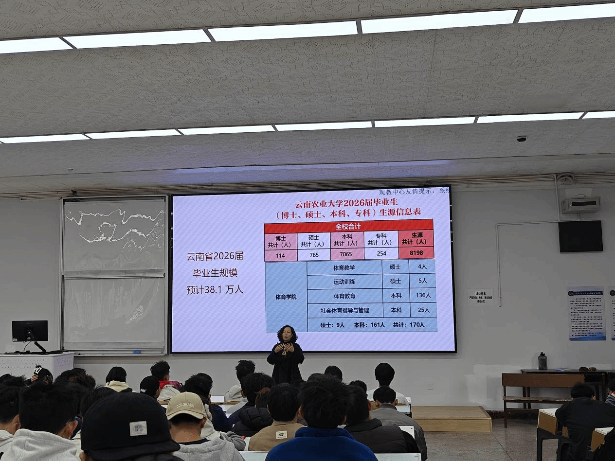 张东艳主任结合当前全国及云南省高校毕业生就业形势,从宏观政策、行业趋势、岗位需求等多个维度进行了深入分析。她指出,2026届全国高校毕业生预计达1270万人,云南省毕业生规模持续扩大,就业竞争依然激烈。她详细介绍了学校2026届毕业生生源结构及体育学院毕业生的专业分布情况,并结合体育教育、社会体育指导与管理等专业特点,分析了体育行业的发展机遇与挑战。在就业准备方面,张东艳主任从职业定位、简历制作、面试技巧、求职渠道等方面进行了系统讲解,鼓励毕业生树立“先就业、后择业、敢创业”的理性择业观,主动适应市场变化,积极投身基层、服务云南。她还介绍了学校就业平台的使用方法、政策性岗位招录安排及各类求职资源获取渠道,为毕业生提供了实用的求职指南。